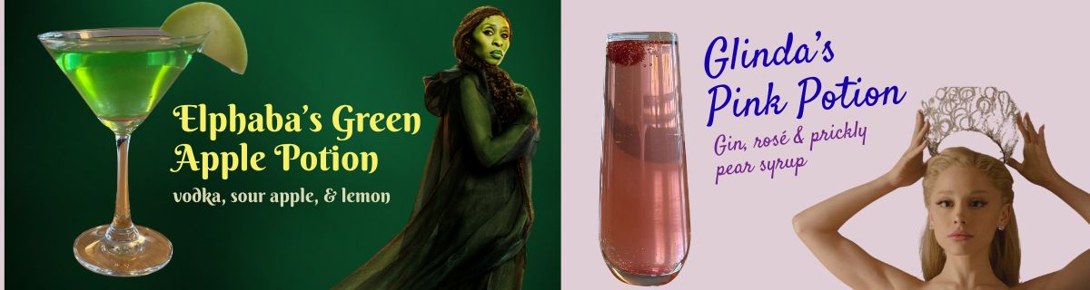 Our themed Wicked: For Good cocktails can be purchased at the bar or online as an add-on to your tickets (Thurs-Sun): Savor our limited-edition Glinda’s Pink Potion or Elphaba’s Green Apple Potion . $16 nonmember/$14.50 members.